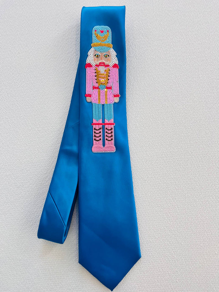 Set against a deep sapphire background, this upcycled silk tie features a delicately beaded nutcracker in shades of pink, gold, and blue. A piece that balances strength with grace.