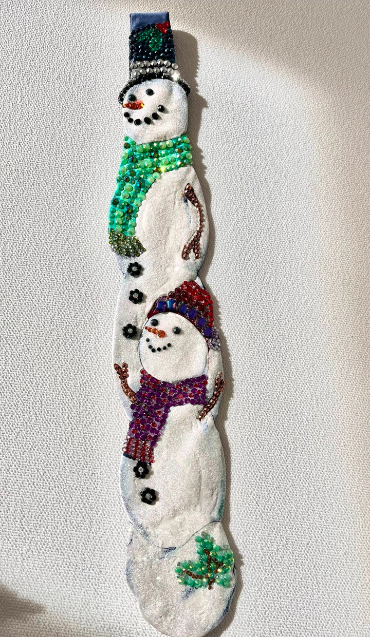 This upcycled holiday necktie features a duo of snowmen brought to life with layered crystals and textured fabric. Each piece is placed by hand to create a bright, artistic winter look. A unique accessory for seasonal events.