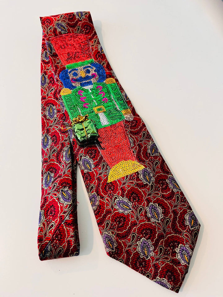 A bold red floral pattern accented by a green and gold nutcracker motif. Detailed with a metallic present and traditional sequin artistry, this design blends nostalgia with elegance.